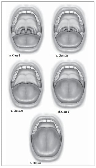 Figure 2. Friedman tongue position (FTP): (a) Class 1 visualizes the uvula and tonsils/pillar. (b) Class 2a visualizes most of the uvula but not the tonsils/pillar. (c) Class 2b visualizes the entire soft palate to the uvular base. (d) Class 3 shows some of the soft palates with the distal end absent. (e) Class 4 visualizes only the hard palate [31].