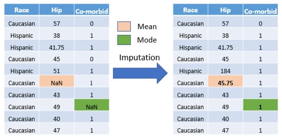 In this work, we applied a statistical imputation approach [35,36]. All missing values for each attribute were replaced with a statistical measure that was calculated from the remaining values for that attribute. The statistics used were the mean and mode for the numeric and nominal features, respectively. These methods were chosen because they are fast, easy to implement, prevent information loss, and work well with a small dataset. Figure 3 depicts an example of missing value imputation.