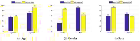 Figure 4. Bar charts comparing data samples with and without obstructive sleep apnea (OSA) grouped by age, gender, and race. The charts provide insights into the prevalence of OSA within different demographics.