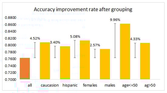 Figure 9. Bar chart of accuracy percentage change after grouping based on age, gender, and race. The figure compares the accuracy of the model when using the entire dataset (all) to the accuracy after grouping based on age, gender, and race. Positive values denote an increase in accuracy, thus showcasing the effectiveness of grouping based on these demographic factors.