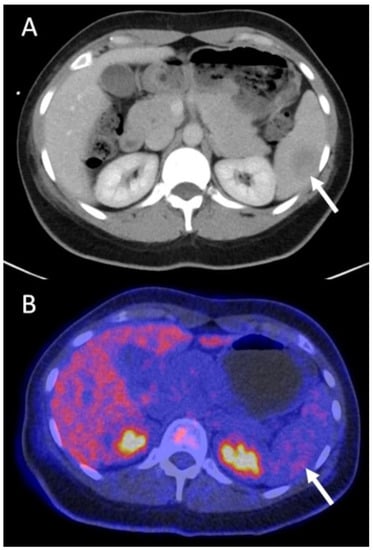 A 37-year old female patient with grade 3 NST of the left breast. Tumor stage pT3, pN1. Initial primary staging CT shows an ill-defined, slightly hypodense splenic lesion, highly suspicious for a distant metastasis (arrow in (A)). Additional FDG PET/CT does not show elevated tracer-uptake, excluding a metastasis, thus ruling out M1 stage and leading to a major change in management (arrow in (B)). NST = invasive carcinoma of no special type.