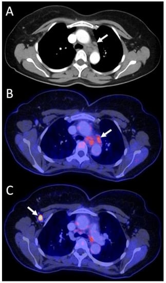 A 44-year old female patient with high-grade NST of the right breast and axillary lymph node metastases. The arrow in the initial contrast-enhanced staging CT shows enlarged mediastinal lymph nodes suspected to be nodal metastases (A). In the FDG PET/CT the mediastinal lymph nodes reveal only moderate tracer uptake (arrow, SUVmean 2.5, SUVmax 3.9) (B) in comparison to the histopathologically proven axillary lymph node metastases (arrow, SUVmean 8.9, SUVmax 13.2) (C). The mediastinal lymph nodes were interpreted as benign, and thus M1 stage was ruled out, allowing inclusion into a clinical trial and modification of systemic therapy. i.e., a major management change. NST = invasive carcinoma of no special type.