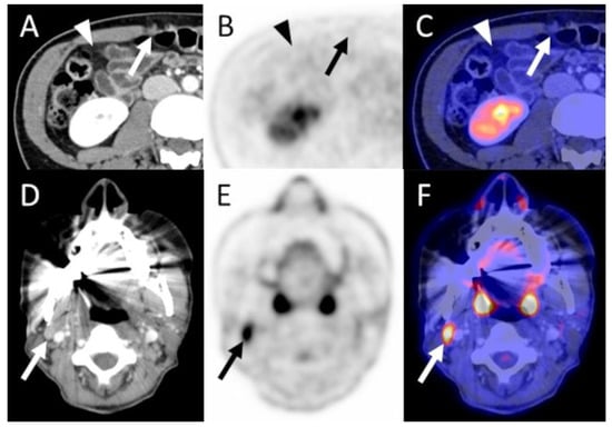 A 42-year old female patient with grade 3 NST in the right breast, stage T1c N0 M0 diagnosed three years prior. FDG PET/CT was performed due to histologically proven axillary nodal recurrence (not shown, SUVmean 5.3, SUVmax 7.4) as well as a nodular peritoneal soft tissue lesion in the right mid-abdomen (arrow in (A)) and slight diffuse hyperdense changes to the abdominal fat (arrowhead in (A)) detected in the CT, concerning regarding peritoneal metastases. PET/CT did not show pathological tracer uptake of these lesions, and peritoneal metastases were ruled out (arrows and arrowheads in (B,C)). However, PET/CT allowed for the detection of an additional FDG-avid (SUVmean 5.6, SUVmax 7.8) cervical lymph node (arrows in (E,F)) which was not easily discernable on CT alone (arrow in (D)), due to beam hardening artifacts as well as multiple other slightly enlarged bilateral cervical lymph nodes, and thus was not interpreted as suspicious in the CT. The interdisciplinary tumor board regarded this lymph node as highly suspicious and decided against an additional biopsy. The initially planned resection of the axillary lymph node metastases was not performed. Instead, the patient received systemic treatment. Thus, the FDG PET/CT led to a major change in management. Furthermore, an initially considered diagnostic laparoscopy for evaluation of the suspicious peritoneal CT findings was deemed unnecessary. NST = invasive carcinoma of no special type.