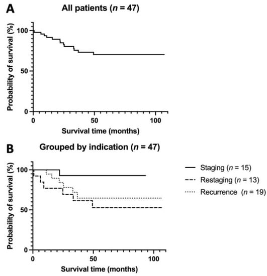 Kaplan–Meier OS analysis for (A) all patients and (B) grouped by indication subgroup. (A) Kaplan–Meier OS analysis of all 47 patients. Five-year OS was 72.3% (mean 82.2 months, 95% CI 70.7–93.7). (B) Kaplan–Meier OS analysis of 47 patients according to the three indication subgroups. Five-year OS was 93.3% in the staging group (mean 88.2 months, 95% CI 78.6–97.8), 53.8% in the restaging group (mean 66.6 months, 95% CI 42.2–90.9, p = 0.069), and 68.4% in the recurrence group (mean 77.9 months, 95% CI 59.0–96.8). OS = overall survival.