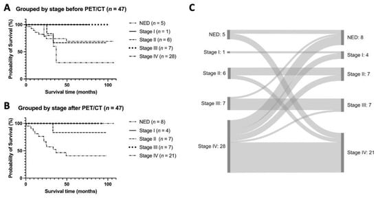 Comparison of OS according to the patients’ tumor stages (A) before and (B) after FDG PET/CT, as well as (C) illustration of the stage shifts. (A) Kaplan–Meier OS analysis of 47 patients according to the tumor stage before PET/CT. Five-year OS was lowest in patients with NED with 40%. Five-year OS was 71.4% in stage IV patients, 100% in stage III patients, 66.6% in stage II patients, and 100% in stage I patient. (B) Kaplan–Meier OS analysis of 47 patients according to the tumor stage after PET/CT. Five-year OS was lowest for stage IV patients with 42.8%. Five-year OS was 100% in stage III patients, 85.7% in stage II and 100% in stage I patients and NED. (C) Sankey diagram illustrating the migration of patients between tumor stages before and after PET/CT. OS = overall survival; NED = no evidence of disease.