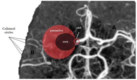 The significance of collateral circulation in the brain stems from the core/penumbra concept, which refers to the observation that a gradient of hypoperfusion is observed during acute ischemic stroke. This gradient ranges from a central region of severe hypoperfusion to peripheral areas with mild hypoperfusion. Visualizing this phenomenon, three concentric zones can be envisioned: a “core” region characterized by severe hypoperfusion, a “penumbra” area where neural cells are dysfunctional yet salvageable with adequate perfusion restoration through intravenous thrombolysis (IVT) and/or mechanical thrombectomy (MT), and an “oligemia” zone where hypoperfusion is mild and recovery is expected even without treatment.