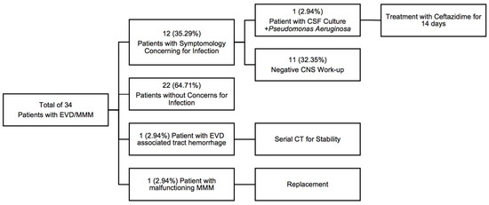 Table 2 provides the EVD and MMM characteristics of the study cohort. The average time from admission to EVD placement was 0.94 ± 1.74 days (range of 0–8 days). A total of 31 (91.18%) patients had an EVD placed within the first two days of admission. Three (8.82%) patients had an EVD placed due to inpatient clinical neurologic worsening 3, 6, and 8 days after admission. Twenty-three patients had a Hemedex quad-lumen bolt placement concurrent with their EVD placement. The mean duration of EVD utilization was 6.90 ± 4.27 days (range of 1–19). In the study cohort, 30 patients underwent surgical decompression that included a craniotomy or a decompressive hemicraniectomy for their TBI. There were three patients who had documented complications from their EVDs and quad-lumen intracranial MMM placements. In the 12 patients who underwent work-up for suspected systemic and/or CNS infection, 1 experienced meningitis with CSF from their EVD growing Pseudomonas Aeruginosa, and this patient was appropriately treated with antibiotics (Figure 3). One patient had an intraparenchymal tract hemorrhage related to the EVD placement that required serial CT imaging. One patient had a malfunctioning MMM that required replacement because the Licox brain tissue oxygen monitor no longer provided reliable calibrations. For this reason, it was replaced with a new Licox catheter sterilely at the bedside. The same craniostomy and quad-lumen port were used, without any associated changes in the clinical outcome.