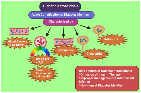 Biochemical characteristics and risk factors of diabetic ketoacidosis. This figure has been drawn with the premium version of BioRender (https://biorender.com/ accessed on 28 June 2023) with license number TD25LTFJ4F. Image credit: Rahnuma Ahmad.