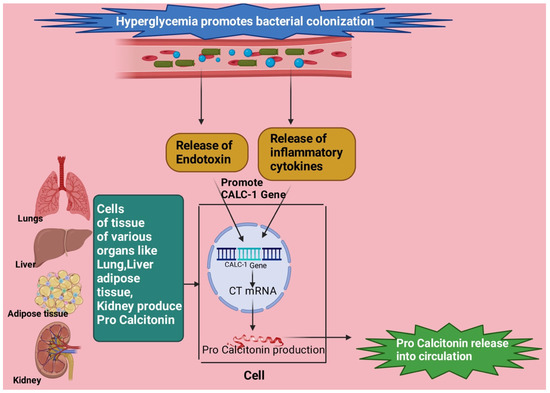 The colonization of bacteria is promoted by hyperglycemic crisis and may lead to raised levels of PCT [57,58]. An induction of PCT by endotoxin and inflammatory cytokines occurs by enabling CALC-I gene transcription and CT mRNA expression in lungs, kidneys, liver, and adipose tissue [57,59] (Figure 3).