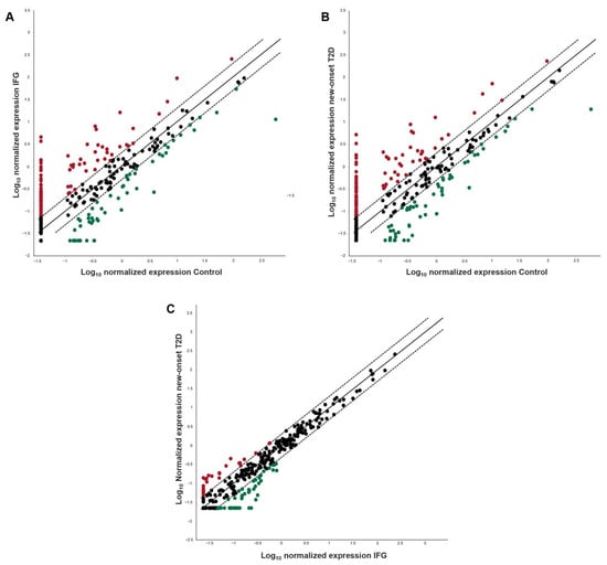 Scatter plot analysis of differential miRNA expression on a logarithmic scale. Red and green dots represent the number of miRNAs that were found to be over-expressed (fold regulation values > 2) and under-expressed (fold regulation values < −2), respectively, in (A) IFG vs. control group; (B) new-onset T2D vs. control group, (C) new-onset T2D vs. IFG group. Black dots represent a lack of differential expression (unvaried miRNAs).