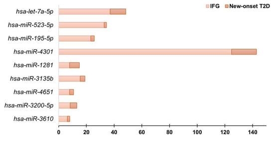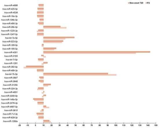 A total of 33 circulating miRNAs showed considerably different expression levels between patients with IFG or new-onset T2D and matched euglycemic controls (Figure 2). This was determined by using a stringent analysis method (global Ct mean) and considering only those miRNAs whose expression level was relatively low (fold regulation < 10) in either the control or the test group and is reasonably high in the other group (fold regulation ≥ 10). Some miRNAs, such as hsa-miR-1260a, hsa-miR-4687-5p, hsa-miR-3135b, hsa-let-7b-5p, hsa-let-7a-5p, hsa-miR-4301, hsa-miR-195-5p, hsa-miR-523-5p, hsa-miR-26b-5p were differentially expressed in both IFG and new-onset T2D compared to euglycemic control subjects (Figure 2). Notably, 9 miRNAs (hsa-miR-3610, hsa-miR-3200-5p, hsa-miR-4651, hsa-miR-3135b, hsa-miR-1281, hsa-miR-4301, hsa-miR-195-5p, hsa-miR-523-5p, hsa-let-7a-5p) displayed a significant increase in fold regulation values, calculated using the euglycemic control subjects as the reference group, specifically in patients with new-onset T2D compared to those with IFG (Figure 3). This finding suggests their potential as early biomarkers for disease progression from prediabetes to T2D. Moreover, from a comparative analysis of relative fold regulation data, using the conventional threshold > 2 for up-regulation and <−2 for down-regulation automatically implemented by the Geneglobe software, it was found that hsa-miR-146a-5p was considerably down-regulated while hsa-miR-1225-3p was up-regulated uniquely in individuals with newly diagnosed T2D in comparison to euglycemic controls (fold regulation in new-onset T2D vs. controls, hsa-miR-1225-3p: 3.6; hsa-miR-146a-5p: −2.6). These changes in expression levels were not observed in individuals with IFG, despite a similar trend in direction (fold regulation in IFG vs. controls, hsa-miR-1225-3p: 1.9; hsa-miR-146a-5p: −1.3). Previous research has reported that hsa-miR-146a-5p plays a role in glucose metabolism, insulin resistance and development of T2D complications [35,36,37], whereas, to our knowledge, no association between hsa-miR-1225-3p and T2D has been formerly described.