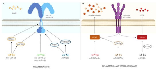 Hypothetical mechanisms by which some of the circulating deregulated miRNAs described in this study may cause insulin resistance (A), inflammation and vascular damage (B), leading to susceptibility to T2D development. Circulating miRNAs and their predicted target genes are indicated with matched colors.