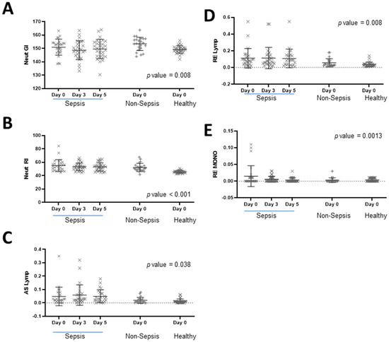 Furthermore, the collective EIPs that indicate activation states of specific white blood cells (as shown in Figure 1) were statistically significant among all three groups, as determined by one-way ANOVA. Interestingly, when we looked at the serial measurements among the sepsis cohort from Days 0 to 5, we did not find any statistically significant differences. The changes in the variables of Neut-GI, Neut-RI, AS-Lymph, RE-Lymph, and RE-MONO in response to antimicrobial therapy on Day 0, Day 3, and Day 5 were expressed using a scatter plot with the mean and standard deviation (Figure 1).
