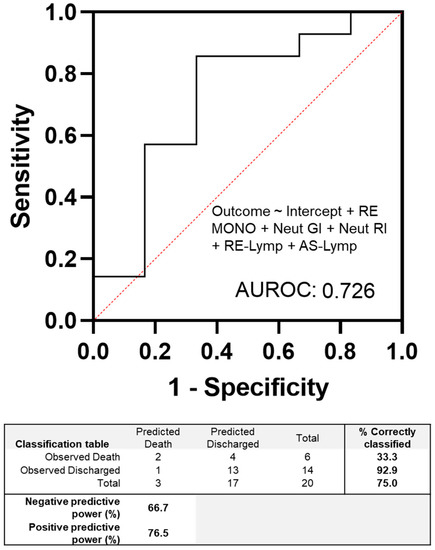The multiple logistic regression analysis was performed on the EIPs shown in Figure 2 to model the outcome of patients with negative cultures, either death or discharge. We used a cut-off of 0.5 to classify patients into these two categories. The limited sample cohort achieved an accuracy of 75% in correctly classifying the outcomes of patients. The positive and negative predictive powers were 76% and 67%, respectively. Interestingly, the results indicated that the EIPs alone correctly identified 92.9% of patients who were discharged using baseline blood measurements.