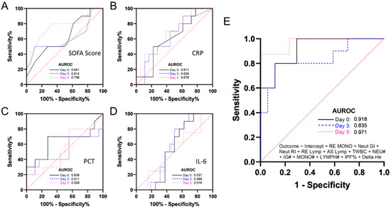 The area under the receiver operating characteristics curve (AUROC) of the SOFA score for worse outcomes was 0.631 at Day 0, 0.614 at Day 3, and 0.758 at Day 5. (B) The area under the receiver operating characteristics curve (AUROC) of CRP for worse outcomes was 0.611 at Day 0, 0.628 at Day 3, and 0.678 at Day 5. (C) The area under the receiver operating characteristics curve (AUROC) of the PCT for worse outcomes was 0.639 at Day 0, 0.511 at Day 3, and 0.528 at Day 5. (D) The area under the receiver operating characteristics curve (AUROC) of IL-6 for worse outcomes was 0.531 at Day 0, 0.569 at Day 3, and 0.519 at Day 5. (E) The area under the receiver operating characteristic curve (AUROC) of a combination of haematological variables of RE-MONO + Neut-GI + Neut-RI + RE-Lymp + AS-Lymp + TWBC + NEU# + IG# + MONO# + LYMPH# + IPF% + Delta He for worse outcomes was 0.918 at Day 0, 0.835 at Day 3, and 0.971 at Day 5.