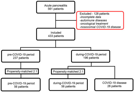 Out of a total of 561 patients with AP hospitalized in the surgery department, the number of patients eligible for the study decreased to 433 after applying the exclusion criteria. We divided the patient cohort into two groups, based on the timeframe before and after the confirmation of the first case of COVID-19 infection in Romania, that is, 26 February 2020. Thus, we defined a pre-COVID-19 group (which includes patients treated between 1 January 2018 and 25 February 2020) and a group during the COVID-19 pandemic (which comprises patients treated between 26 February 2020 and 30 April 2022).