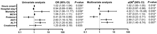 Forest plot with univariate and multivariate analysis of clinical and biological parameters comparing the pre-COVID-19 and during-COVID-19 group; * p < 0.05—statistically significant; #—adjusted OR for age, sex, severity; MCV—mean corpuscular volume; AST—aspartate aminotransferase; ALT—alanine aminotransferase.