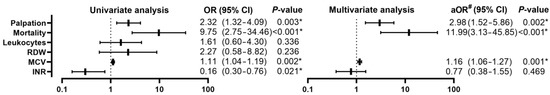 Multivariate analysis after adjusting for age, sex and severity showed a slight increase in mortality with an OR 11.99 (95% CI, 3.13–45.85; p < 0.001), palpation sensitivity with an OR 2.98 (95% CI, 1.52–5.86; p < 0.001). p = 0.002), without significant change in OR value of MCV 1.16 (95% CI, 1.06–1.27; p = 0.001).