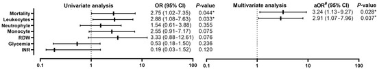 Multivariate analysis showed a slight increase in the OR to 3.24 (95% CI, 1.13–9.27; p = 0.028) for mortality, without significant change in the value of the OR of leukocytes 2.91 (95% CI, 1.07–7.96; p = 0.037).