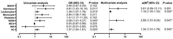 Forest plot with univariate and multivariate analysis of clinical and biological parameters comparing mortality in the pre-COVID-19 group; * p < 0.05—statistically significant; #—adjusted OR for age, sex, severity; MSOF—Multiple organ failure; RDW—red cell distribution width; MCV—mean corpuscular volume; INR—international normalized ratio; IIC—cumulative inflammatory index.
