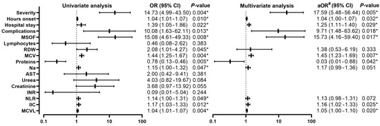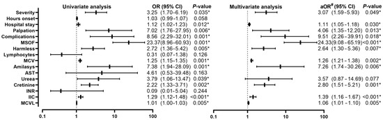 Forest plot with univariate and multivariate analysis of clinical and biological parameters comparing mortality in the during-COVID-19 group; * p < 0.05—statistically significant; #—adjusted OR for age, sex, severity; MSOF—Multiple organ failure; MCV—mean corpuscular volume; AST—aspartate aminotransferase; INR—international normalized ratio; NLR—neutrophil-lymphocyte ratio; IIC—cumulative inflammatory index; MCVL—lymphocyte MCV ratio.