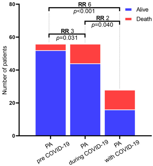 This study revealed the negative impact of the pandemic and SARS-CoV-2 infection on patients with AP, and this result was highlighted by calculating the relative risk (RR) for each individual period compared to the period before the pandemic (Table 6). The evidence from the study shows that patients during the pandemic had a relative death risk of three compared to patients with AP before the pandemic, underlining the negative impact of the pandemic on patients during this period (Figure 8). In addition, patients with AP and SARS-CoV-2 infection had a relative death risk of six compared to patients with AP before the pandemic.