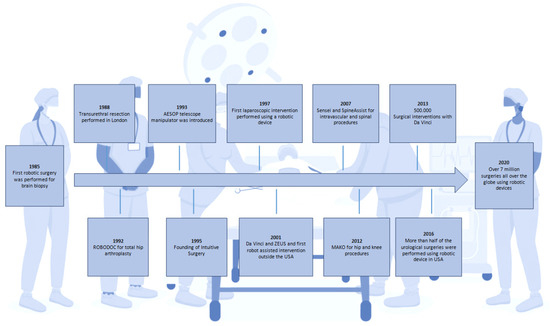 In contrast, with the advent of laparoscopy and minimally invasive surgery, the incisions have become considerably smaller than in traditional surgery, and the recovery time, risk of infection, and postoperative discomfort have all lowered significantly. Most of the time, however, tiny incisions render it difficult or impossible to palpate deep structures. The introduction of a transducer for the detailed imaging of anatomical structures seemed inconceivable. To mitigate these shortcomings, hybrid robotic systems associating an imaging component have been developed to restore the surgeon’s comfort and surgical precision [5] (Figure 1). Robotic assistance now provides the surgeon with enormous precision and strength at the end of the robotic arm, while its association with ultrasound imaging provides an in-depth evaluation of tissues. This enables the identification of dissection plans between the densest structures, which is an unprecedented achievement, especially for the removal of malignant tumours where precision oncological surgery can differentiate between tumour-free margins or involved edges. For the treatment of cancer, the implications are even more compelling as cancer has been recognised as a difficult and often untreatable disease even since antiquity. The progresses of surgery can go back to the first description of a tumour which can be found in the Edwin Smith Papyrus, written approximately 5000 years ago, detailing breast cancer. Most, if not all, ancient civilisations referred to various cancers and ways to treat them, from the aforementioned Egyptians to the Romans. Various causes were attributed to this scourge; one of the most influential was Galen’s theory of humours. While Galen himself advised against surgery, other renowned Roman doctors such as Celsus or Pliny the Elder did mention or recommend surgery as a potential therapy. Later on, during the Middle Ages, Arabic doctors developed and described several techniques for the surgical excision of tumours, followed by Western doctors in the years preceding the Renaissance, despite the Catholic Church’s admonition of surgical interventions [6].