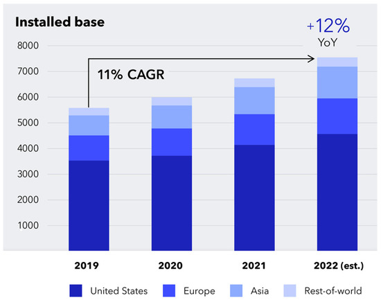 Worldwide distribution of da Vinci robotic surgical systems between 2019 and 2022 (https://isrg.gcs-web.com) (accessed on 12 June 2023).