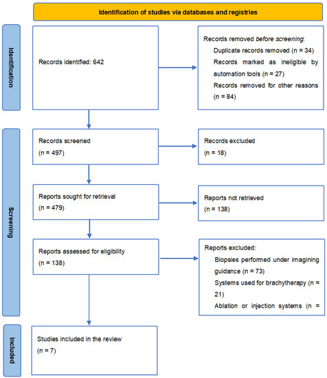 We found 642 results for our keywords. Setting the limit of articles published after 2010 resulted in a total of 479 articles. Also, only full-text articles were selected, resulting in 138 articles. Finally, after applying the inclusion and exclusion criteria, seven articles corresponded to the requirements (Figure 2).