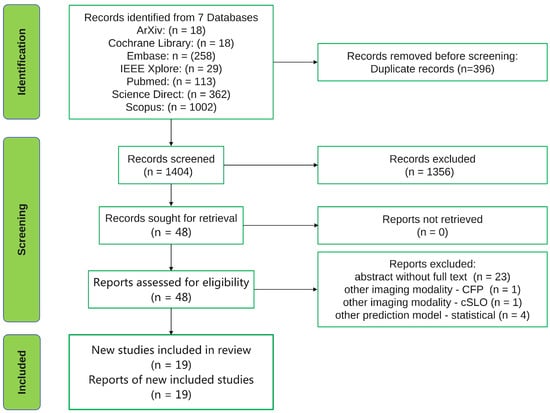 The systematic review was carried out following the 2020 Preferred Reporting Items for Systematic Reviews and Meta-Analyses (PRISMA) guidelines [11]. Due to the unsatisfactory reporting in systematic reviews [12], the PRISMA statement was intended to serve as a reporting guideline, ensuring that reviewers conduct their work in a transparent manner permitting their readers to fully understand their reasonings, means and findings. We searched seven databases for all articles published before 1 January 2022 and this resulted in a total of 1800 records being retrieved and uploaded in the reference manager software Mendeley. After removing 396 duplicate records using the Mendeley software, 1404 records remained for screening. The 1404 records were split in half and two authors (G.A.M. and S.A.R) independently screened the titles and abstracts of the records for each half. This process led to the exclusion of 1356 records. Following exclusion, 48 full-text articles were retrieved and assessed for eligibility independently by the same two authors (G.A.M. and S.A.R). In cases of disagreement, consensus regarding inclusion/exclusion was reached through discussions and, if necessary, a third author (A.M.) was consulted. In this review, we included all journal papers and conference papers found in the previously mentioned databases using the following keywords for searching: “machine learning” or “deep learning” and “age-related macular degeneration” and “OCT”. The PRISMA flow chart is displayed in Figure 1.