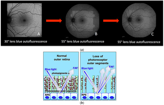 Blue-light irradiation causes a reduction of the photopigment density in the photoreceptor outer segments (due to the absorption of photons induced by the isomerization of 11-cis retinal to all-trans retinal), causing increased visualization of the autofluorescence signal coming from the RPE. This process is called photobleaching [4,5,6]. An illustrative example shows a normal fundus exposed to blue light coming from a 30° lens (Figure 1a (A)); immediately thereafter, when the same eye is exposed to blue light coming from a wider lens (Figure 1a (B)) this reveals the exhausted photopigment previously exposed to the 30° lens. After some time, the photopigment from the entire retina exposed to blue light from the wide lens is uniformly reduced and the fundus appears bleached (hyperautofluorescent) (Figure 1a (C)). Therefore, in case of damage to the photoreceptors, the consecutive reduction of the photopigment density will lead to a similarly increased visibility of the normal underlying RPE lipofuscin and, hence, increased autofluorescence (hyperautofluorescence).