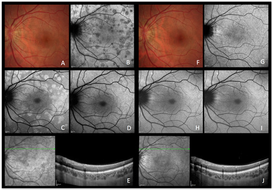 While FA showed faint hyperfluorescence (Figure 8B,F), ICGA did not demonstrate hypofluorescence, indicating preserved choriocapillaris and the absence of choriocapillaris nonperfusion (Figure 8C,G). The increased BAF and the loss of the EZ and IZ on SD-OCT clearly documented the loss/disruption of the photoreceptor layer.