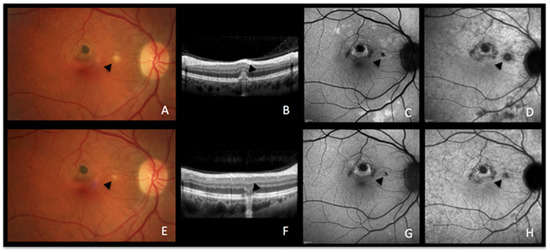 A 51-year-old woman consulted, complaining of recurrent photopsias in her right eye. The colour fundus photograph, together with SD-OCT (Figure 3A,B), BAF, and ICGA (Figure 3C,D) at baseline showed an active lesion (Figure 3A, black arrowhead), coexistent with older punched-out atrophic chorioretinal lesions. In the recurrent phase of the disease, active novel chorioretinal lesions have the same aspect as MEWDS lesions on multimodal imaging, indicating that the lesion process is most probably comparable. The similar BAF and ICGA features of MEWDS (Figure 2B,C) and MFC (Figure 3C,D) confirm that both entities are due to choriocapillaritis. In the convalescent phase, the colour fundus photograph, SD-OCT, BAF, and ICGA showed the atrophic changes of the healed inflammatory focus (Figure 3E–H).