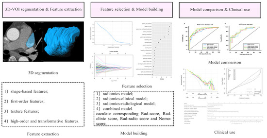 Transesophageal echocardiography is the gold standard for detecting LAAT; however, as a semi-invasive technique requiring anesthesia, it is operator-dependent, uncomfortable, and can cause fatal complications such as gastrointestinal laceration or perforation [8,9]. Before routine clinical AF ablation, electrocardiogram-gated pulmonary venography is performed to assess the size of pulmonary vein ostium, the size of the left atrium, and the LAAT. But this is based on single-phase computed tomography angiography (CTA) with a reported poor positive predictive value [10]. This is because filling defects on single-phase CTA makes it difficult to differentiate between LAAT and circulatory stasis. A delayed scanning protocol is a reasonable alternative to transesophageal echocardiography, but it results in additional radiation exposure [10]. Hur et al. [11] reported that dual-energy computed tomography (CT) would be helpful for detecting LAAT, but the unavailability in most hospitals hinders its wide application. Recently, radiomics with machine learning algorithms has been used as a tool to convert invisible, qualitative, radiological image information into mineable, high-dimensional, quantitative, mathematical data for analysis, in the hope of improving diagnostic performance and conducting prognostic evaluation [12]. These quantitative data analyzed from biomedical images including intensity, shape, size or volume, and texture features may reflect underlying pathophysiology information (the basic concept of the radiomics process) different from conventional clinical and laboratory results [12]. As for radiomics based on cardiac CT images, it has been gradually reported to be valuable in the identification of high-risk atherosclerotic lesions, assessment of plaque microenvironments or vulnerability, detection of myocardial ischemia, and differentiation of cardiac mass [13]. Several radiomics studies involving thrombi were carried out to investigate abdominal aortic aneurysms’ growth status, predict aggressive type 2 endoleaks after endovascular aneurysm repair, and identify cardioembolic stroke before recanalization [14,15,16]. So, radiomics has shown great application prospects in many fields and we have speculated that radiomics based on single-phase CTA could identify this potential pathological change between LAAT and circulatory stasis. Previous studies have confirmed that radiomics based on single-phase CTA could be used for detecting LAAT from circulatory stasis [17,18]. But these studies are limited to a small sample size and valvular heart disease. In this study, we aimed to evaluate the diagnostic efficacy of radiomics based on single-phase CTA in the differentiation of LAAT from circulatory stasis in AF patients.