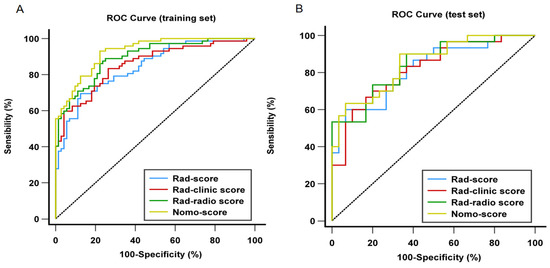 Comparison of receiver operating characteristic (ROC) curves of all four prediction models for distinguishing left atrial appendage thrombus from circulatory stasis in the training (A) and test (B) set. (A) In the training set, AUC = 0.93 for the Nomo-score; 0.90 for the Rad-radio score. 0.86 for the Rad-clinic score; and 0.82 for the Rad-score; (B) in the test set. AUC = 0.85 for the Nomo-score; 0.84 for the Rad-radio score; 0.82 for the Rad-clinic score; and 0.82 for the Rad-score. ROC, receiver operating characteristic curve; AUC, under of the receiver operating characteristic curve.
