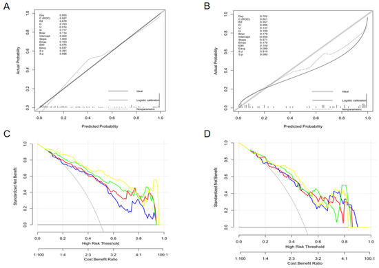 The calibration curves (training set: A; test set: B) and decision curves (training set: C; test set: D) of the combined nomogram. The calibration curves (A,B) depict the agreement of the combined model between the predicted risk and actual probability. The 45° gray line represents the ideal prediction, and the solid black line represents the actual probability of the model. The closer the solid line is to the ideal line, the better the predictive performance of the nomogram is. The decision curve (C,D) is used to assess the clinical utility by calculating the net benefits at different threshold probabilities. The x axis corresponds to the threshold probability while the y axis corresponds to the net benefit. The blue line, red line, green line, and yellow line represents net benefit of the Rad-score, Rad-clinic score, Rad-radio score, and Nomo-score, respectively. The grey line is made with the assumption that all patients are with LAAT. The black line is made with the assumption that no patients are with LAAT. (C) shows that the net benefit of the Nomo-score is better than the other cases when the threshold is not within the range of 78–91% in the training set. (D) Shows that if the threshold probability is less than 82%, the Nomo-score and Rad-radio score demonstrated more benefit than “LAAT all”, “Stasis all”, Rad-score, and the Rad-clinic score at almost all threshold probabilities in the test set.