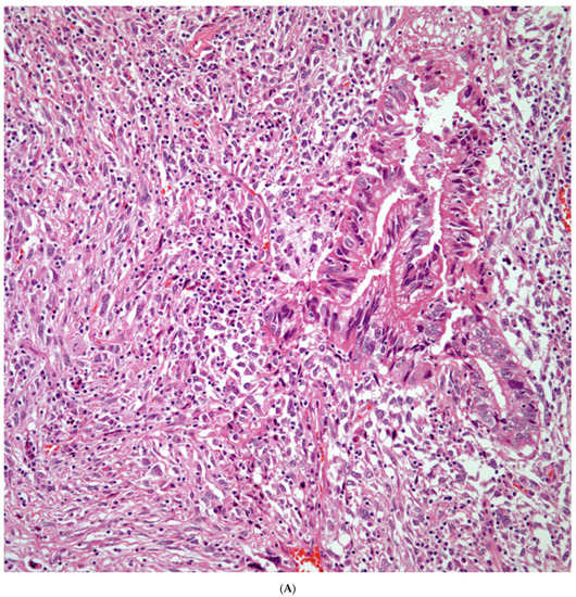 - Humphrey, P.; Scroggs, M.; Roggli, V.; Shelburne, J.D. Pulmonary carcinomas with sarcomatoid element: An immunohistochemical and ultrastructural analysis. Hum. Pathol. 1988, 19, 155–165. [Google Scholar] [CrossRef]