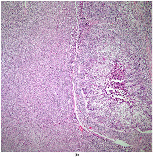 - Serno, J.; Zeppernick, F.; Jäkel, J.; Schrading, S.; Maass, N.; Meinhold-Heerlein, I.; Bauerschlag, D.O. Primary pulmonary choriocarcinoma: Case report and review of the literature. Gynecol. Obstet. Investig. 2012, 74, 171–176. [Google Scholar] [CrossRef] [PubMed]