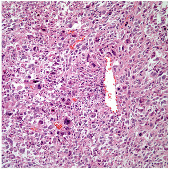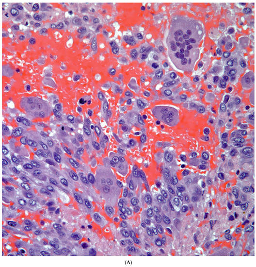 Although the emphasis in most of the reports has been on the presence of the “sarcomatoid” component, there is also another component that is often encountered—the giant cell component. Such a component although known and reported in the literature [20,21,22,23,24], has also been controversial regarding the type of giant cells present. In addition, in most of the documented cases in which the presence of giant cells has been extensive, there is little information regarding the type of giant cells, even though it has been stated that those giant cells are epithelial in origin [25,26,27]. In some cases, due to the similarity of the giant cells with those present in other tumors such as choriocarcinomas (syncytiotrophoblastic cells) plus the expression of human chorionic gonadotrophin in the giant cells, the designation for these tumors has been that of primary choriocarcinoma of the lung [28,29,30,31,32]. One important aspect that is important to highlight is that over the years these tumors appear to be classified by the WHO under headings that are likely incorrect—under large cell carcinoma and in the most recent publication under “Sarcomatoid” carcinoma.