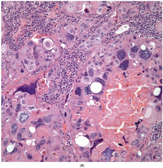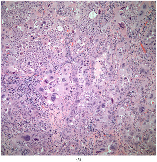 - Ikura, Y.; Inoue, T.; Tsukuda, H.; Yamamoto, T.; Ueda, M.; Kobayashi, Y. Primary choriocarcinoma and human chorionic gonadotrophin-producing giant cell carcinoma of the lung: Are they independent entities. Histopathology 2000, 36, 17–25. [Google Scholar] [CrossRef]
