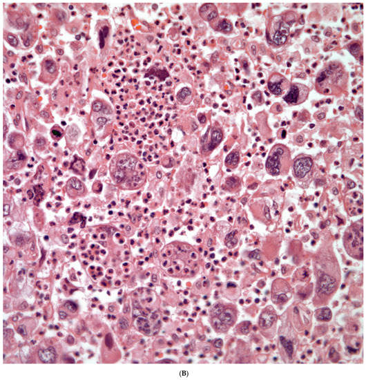 Giant Cell Carcinomas: These tumors may show predominantly a neoplastic cellular proliferation composed exclusively of multinucleated giant cells or a predominantly giant cell carcinoma (Figure 5A,B) or associated with a conventional non-small cell carcinoma like adenocarcinoma or squamous cell carcinoma. The giant cell carcinoma may show giant cells of the syncytiotrophoblastic, osteoclastic, or null cell type. The giant cell carcinomas of the null cell type characteristically show a prominent inflammatory background and giant cells engulfing inflammatory cells (emperipolesis) (Figure 6A,B). The tumors composed of osteoclast-like giant cells show giant cells like those described in bone tumors (Figure 7A,B).