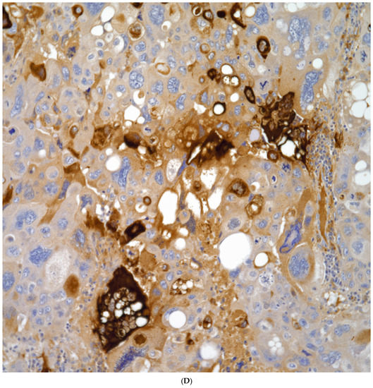 - Chejfec, G.; Candel, A.; Jansson, D.S.; Warren, W.H.; Koukoulis, G.K.; Gould, J.E.; Manderino, G.L.; Gooch, G.T.; Gould, V.E. Immunohistochemical features of giant cell carcinoma of the lung: Patterns of expression of cytokeratins, vimentin, and mucinous glycoprotein recognized by monoclonal antibody A-80. Ultrastruct. Pathol. 1991, 15, 131–138. [Google Scholar] [CrossRef] [PubMed]