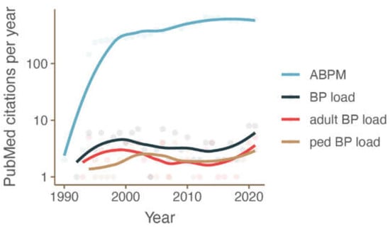 Twenty-four-hour ambulatory blood pressure monitoring (ABPM) has become an increasingly applied tool in both the diagnosis of hypertension and in the assessment of its treatment response. While the main indices derived from ABPM are the systolic and diastolic averages of the time periods of interest (24 h, awake time and asleep time), these do not reflect the variability of blood pressure (BP). Of the different methods developed to estimate variability in an ABPM study, one of the most popular indicators has been the blood pressure load (BPL). Though a few studies used this term in different way, it is most commonly defined as the percentage of BP readings above a certain value, usually the upper limit of normal ambulatory BP, a concept introduced in the late 1980s [,]. Figure 1 shows the stable publication rate concerning BPL over the past three decades. However, the clinical importance of the BPL in adults has not been clearly elucidated, and it has generally not been integrated into adult hypertension guidelines such as those of the ACC/AHA [], Hypertension Canada [] or NICE []. The European Society of Hypertension (ESH) guidelines on ABPM performance stipulate BPL should be included in the research report but not the clinical report [], and BPL is not mentioned in the ESH hypertension guidelines [,]. Past Australian guidelines mentioned BPL [] only to omit it in newer revisions []. Despite this, BPL has been included in the standard reports produced by commonly used ABPM software. Given this significant level of exposure, it is quite possible that BPL has been used in clinical decision making, though we found no studies exploring this.