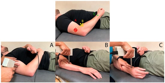 Pressure pain threshold (PPT) points of assessment on the radial nerve. (A) Spiral groove; (B) arcade of Frohse; (C) anatomic snuffbox.