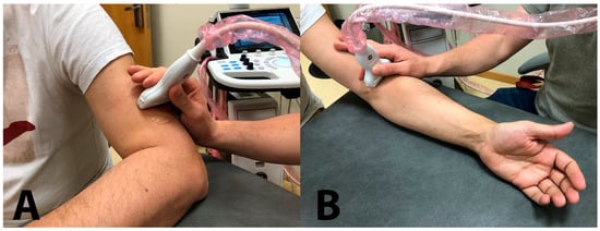 Ultrasound probe location for evaluation of the cross-sectional area of the radial nerve at the spiral groove (A) and the antecubital fossa (B).