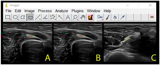 An independent researcher codified, saved, and, after exporting all the images acquired to a DICOM format, sent the files to the examiner. All images were analyzed using the ImageJ offline DICOM software 1.8® (National Institute of Health, Bethesda, MD, USA, v.1.53a). For each point, three measurements were made, then the mean was obtained and used in the comparative analysis. The cross-sectional area of the radial nerve was calculated as follows [21]: