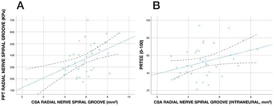 A significant negative association between the cross-sectional area of the radial nerve at the spiral groove with PPT on the radial nerve at the spiral groove (r = −0.496, p = 0.002, Figure 5A) was observed: the greater the cross-sectional area (nerve swelling), the lower the PPT (the higher the pressure pain sensitivity). No other significant association between PPTs and cross-sectional areas was observed. In addition, a significant positive association between cross-sectional area of the radial nerve (intraneural) at the spiral groove with PRTEE score (r = 0.325, p = 0.045, Figure 5B) was also identified: the greater the cross-sectional area (nerve swelling), the higher the PRTEE score (higher disability).