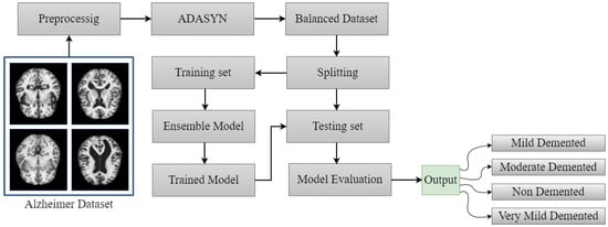 This section describes the Alzheimer’s disease dataset, pre-processing, adaptive synthetic oversampling technique, deep learning and ensemble models, model evaluation metrics, and classification results. Figure 1 briefly represents the workflow of the proposed method. The pre-processed dataset was then utilized for training the pre-trained and proposed method to efficiently and accurately detect Alzheimer’s disease cases. When the training process was complete, the performance of the models was investigated based on unseen data. In the following subsections, the proposed methodology is discussed.