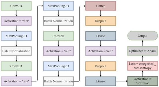 The CNN architecture is shown in Figure 3. It took an input size of 224 × 224 × 3. The CNN architecture had three convolutional two-dimensional layers followed by the RelU activation function, three max pooling layers, and three batch normalization layers. Then, a flattening layer was added to follow the dropout layer. Two dense layers were included, one followed by the activation of the ’RelU’ function and the other by the activation of the soft-max layer.