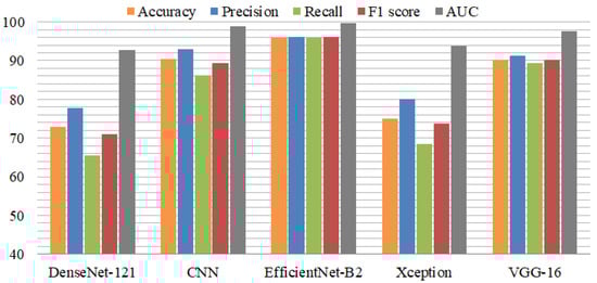 Figure 4 shows the performance comparison of individual models using various metrics. DenseNet-121 and Xception performed poorly in terms of recall score and F1 score. EfficientNet-B2 performed exceptionally, in addition to VGG-16. The area under the curve (AUC) was better than the other metrics.